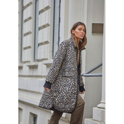 Det fede leopardprint og elegante detaljer som den høje krave, skjulte lommer og ribbede manchetter giver jakken et moderne og sofistikeret look, der er velegnet til hverdagsbrug og urbane outfits.