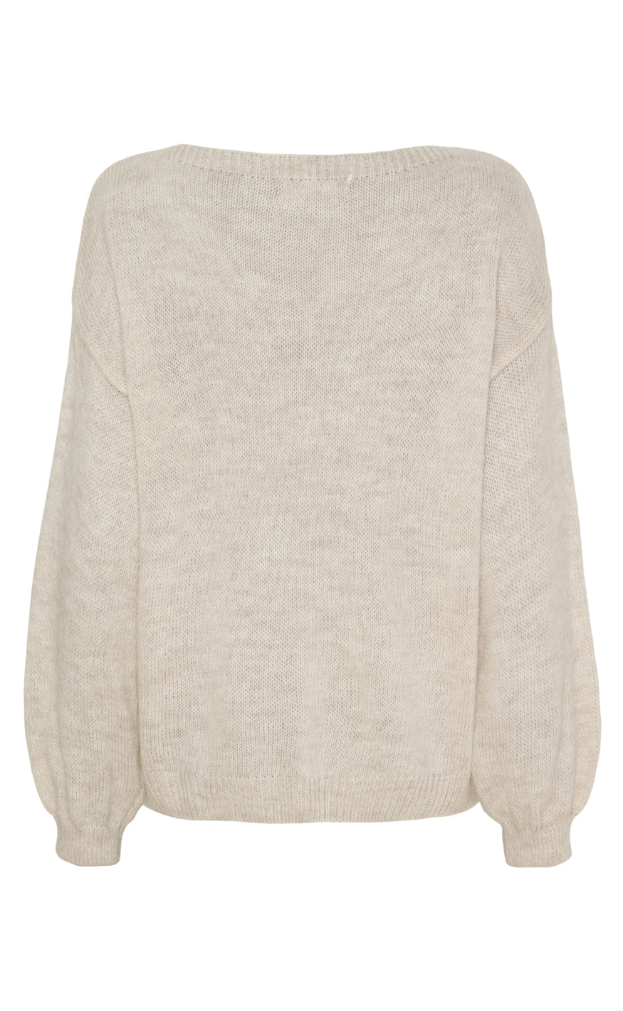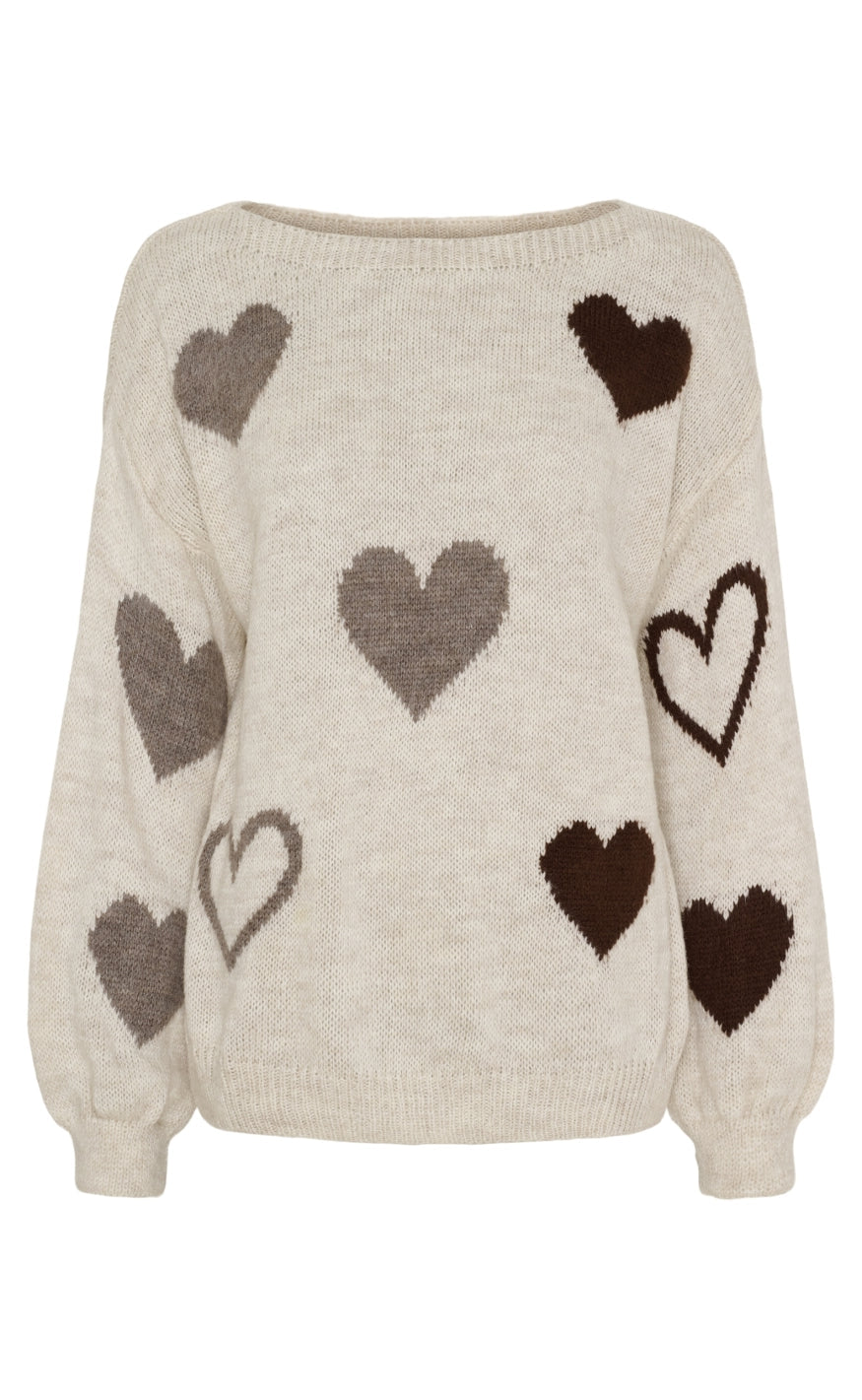 Strikken har en stor halsudskæring, og et hjerte design.