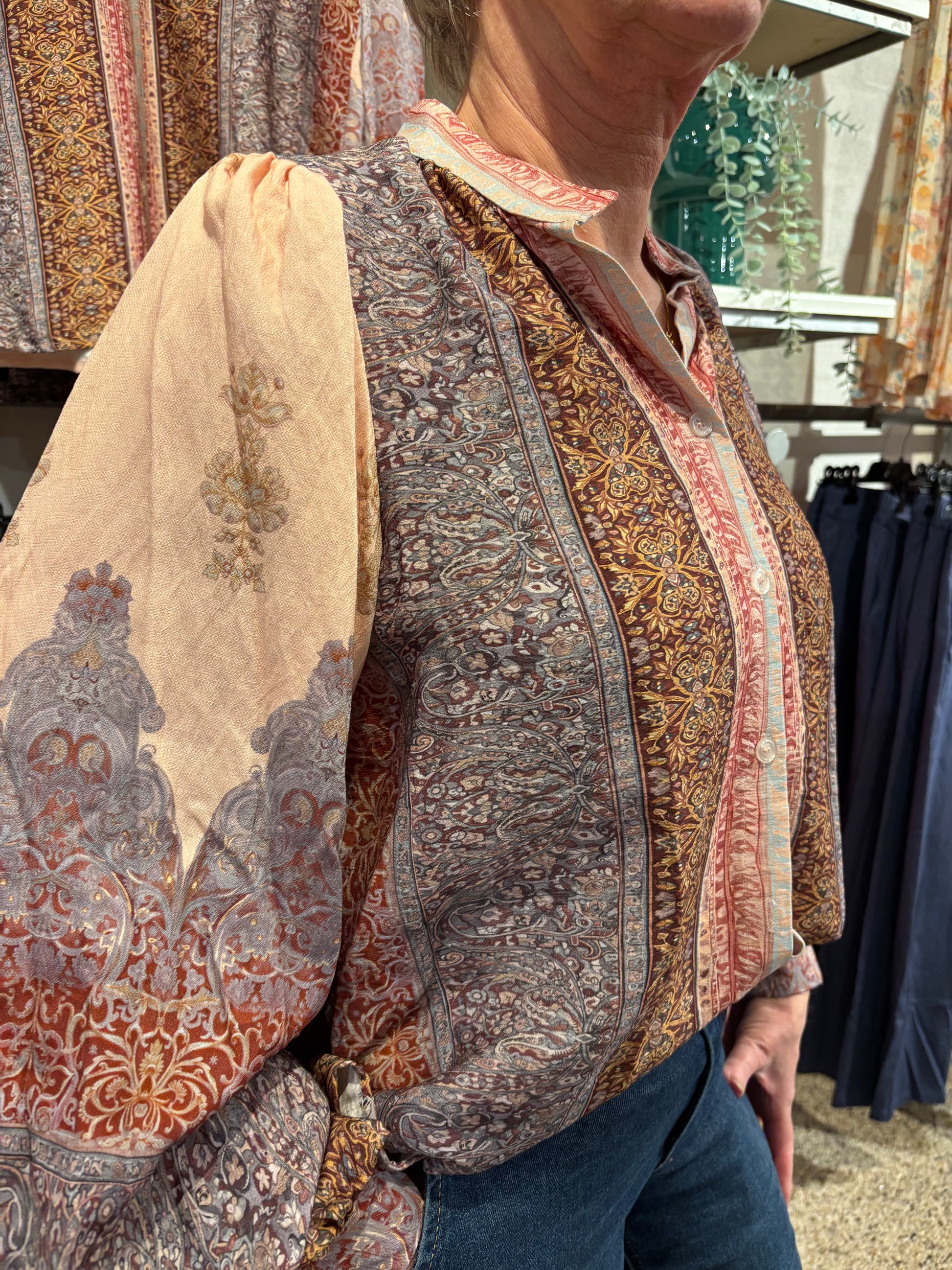 Blusen har lange ærmer med let vidde, V‑udskæring med knaplukning og fine kontrastdetaljer, som giver et sofistikeret og bohemepræget udtryk – perfekt til både hverdag og pæn styling.