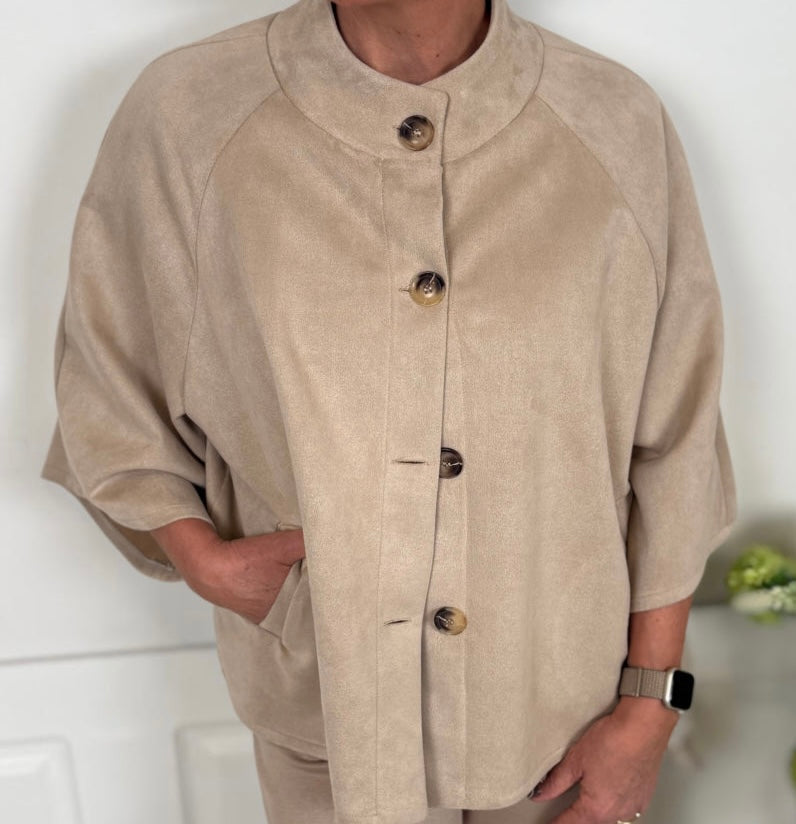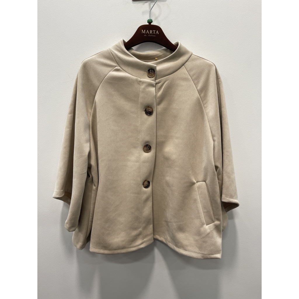 Jakken har rund hals, lange raglanærmer og dekorative knapper foran samt praktiske lommer, som giver et blødt, stilrent og tidløst udtryk.