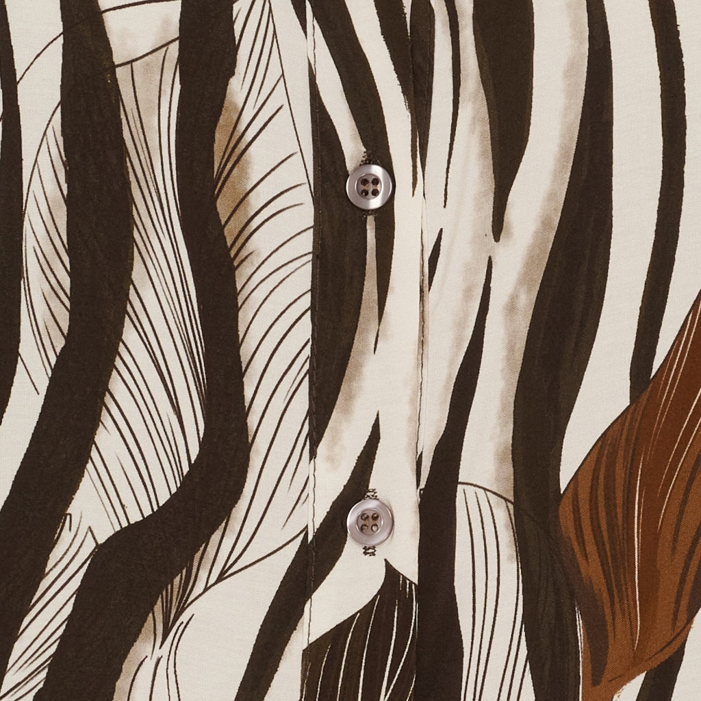 Skjorten har et zebrainspireret stribet design kombineret med store blomsterdetaljer langs kanten, hvilket giver et elegant og unikt udtryk.