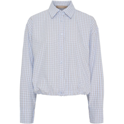 Smart gennemknappet skjorte, med blød elastik forneden, som giver moderigtig ballon siluet.