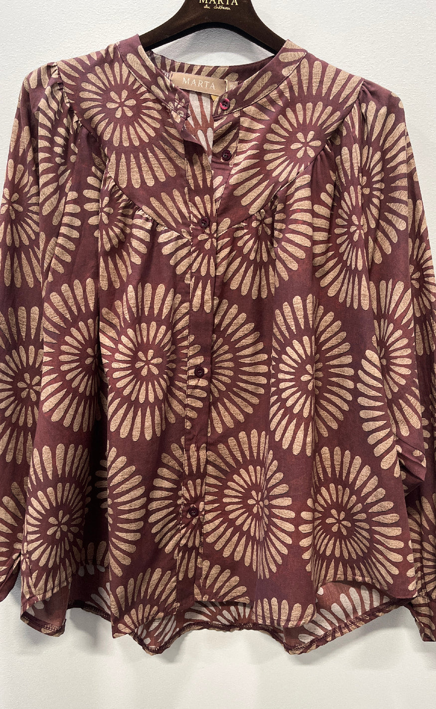 Blusen er gennemknappet og har lange lidt store ærme med rynkdetalje på skuldrene.