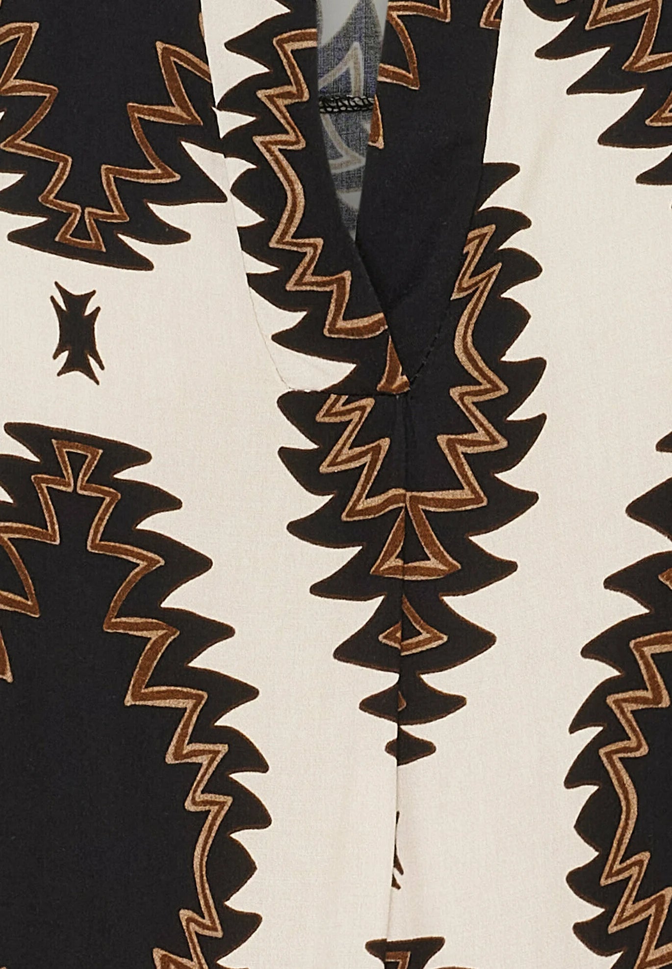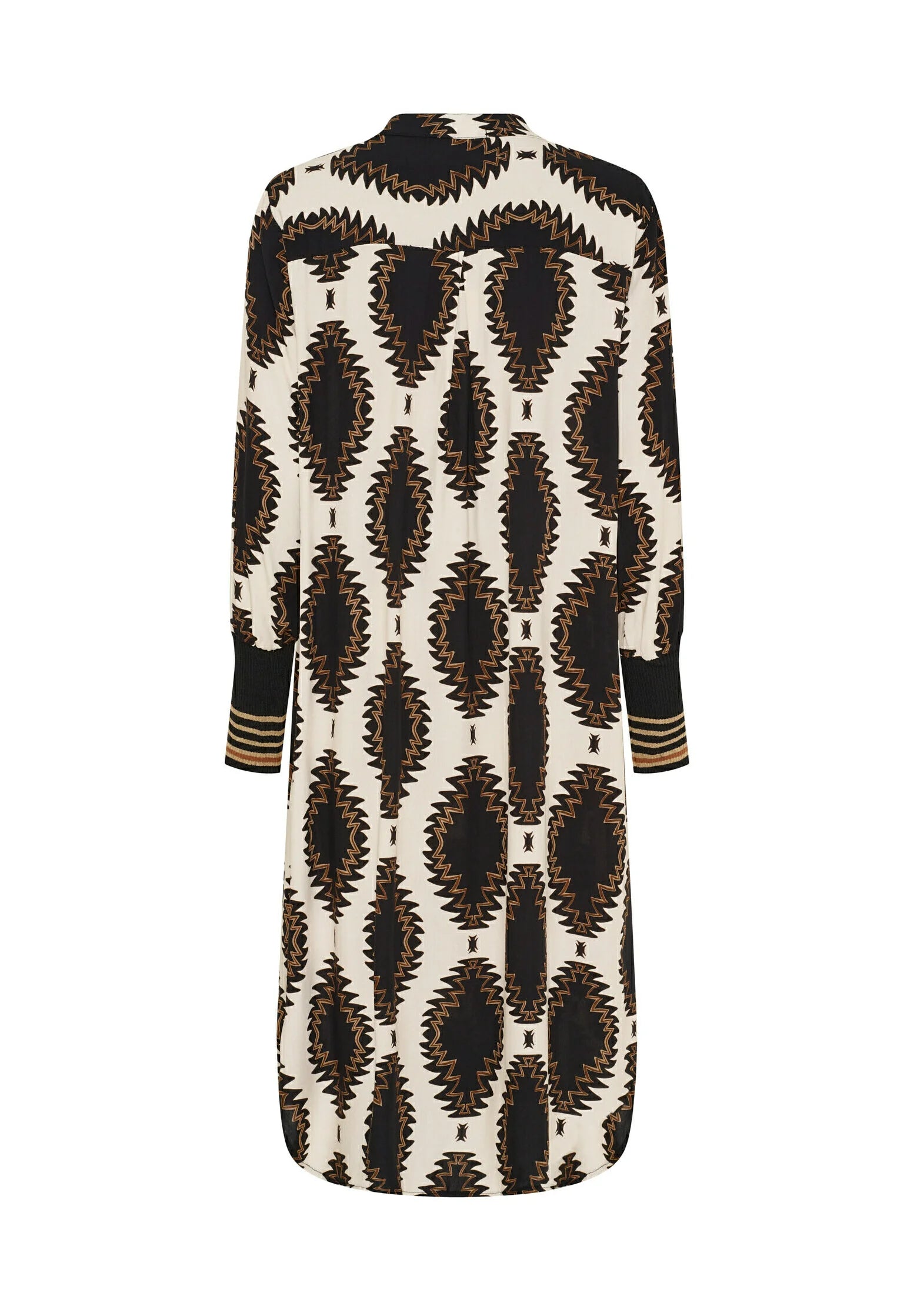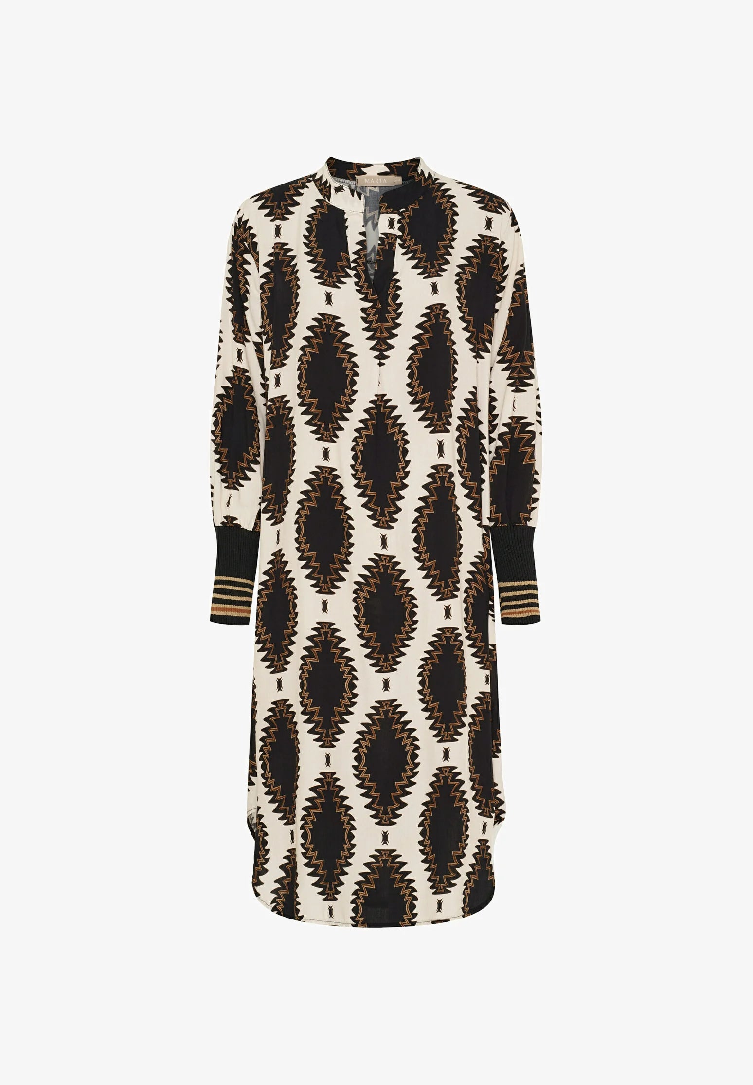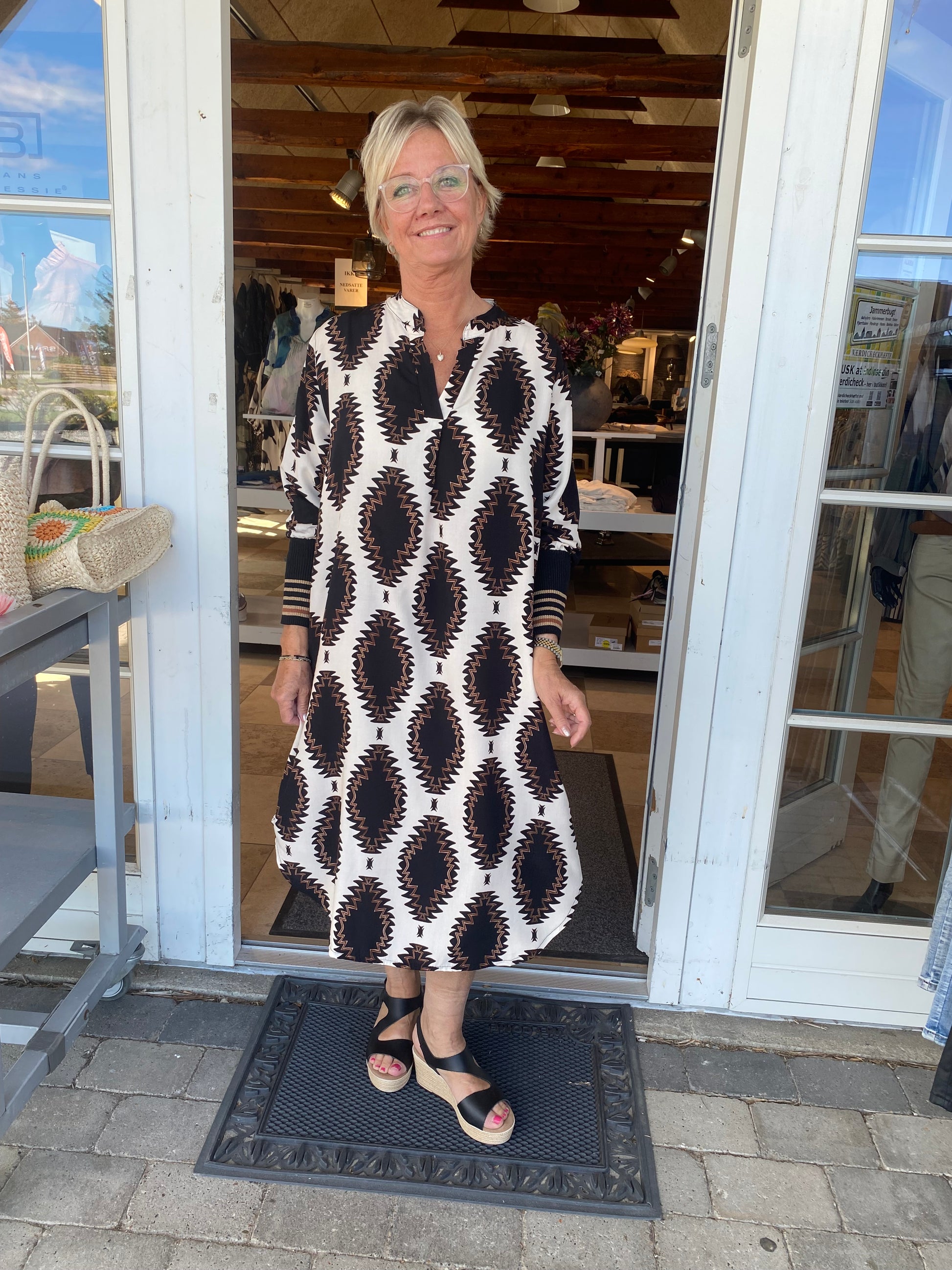 Super flot kjole fra Marta i nogle smukke farver. Kjolen har kinakrave, V-halsudskæring og lange ærmer er afsluttes i en bred ribstrik manchet.