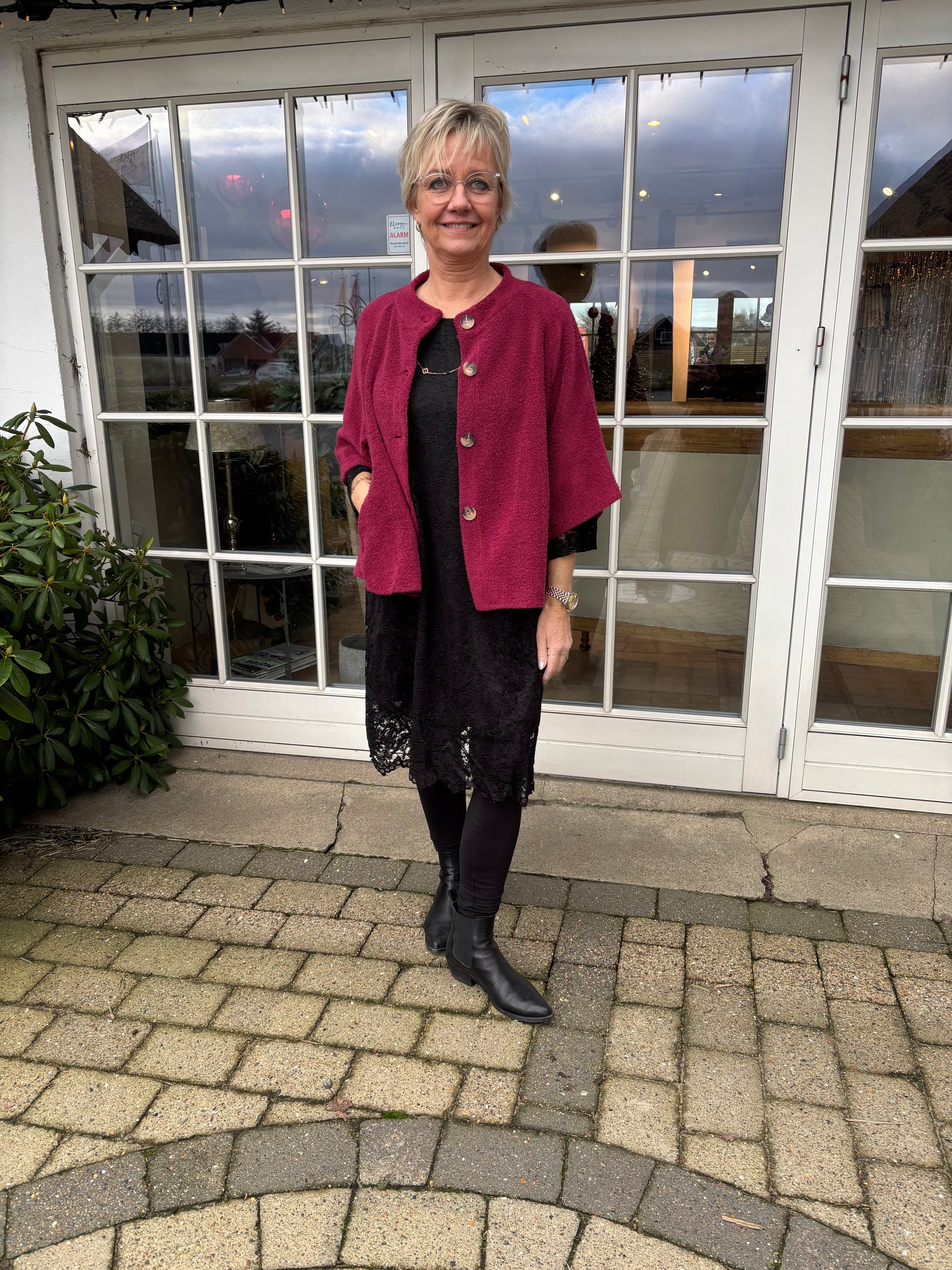 Denne lækre korte jakke er et perfekt alternativ til en cardigan. Jakken har en klassisk knaplukning og en lille kinekrave. Trekvartærmerne gør at den kan bruges over kjoler eller en mesh.