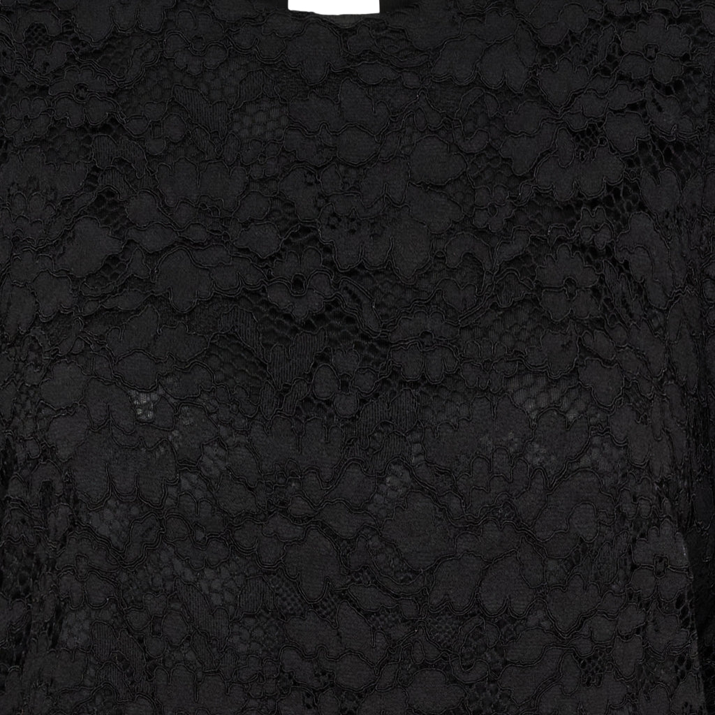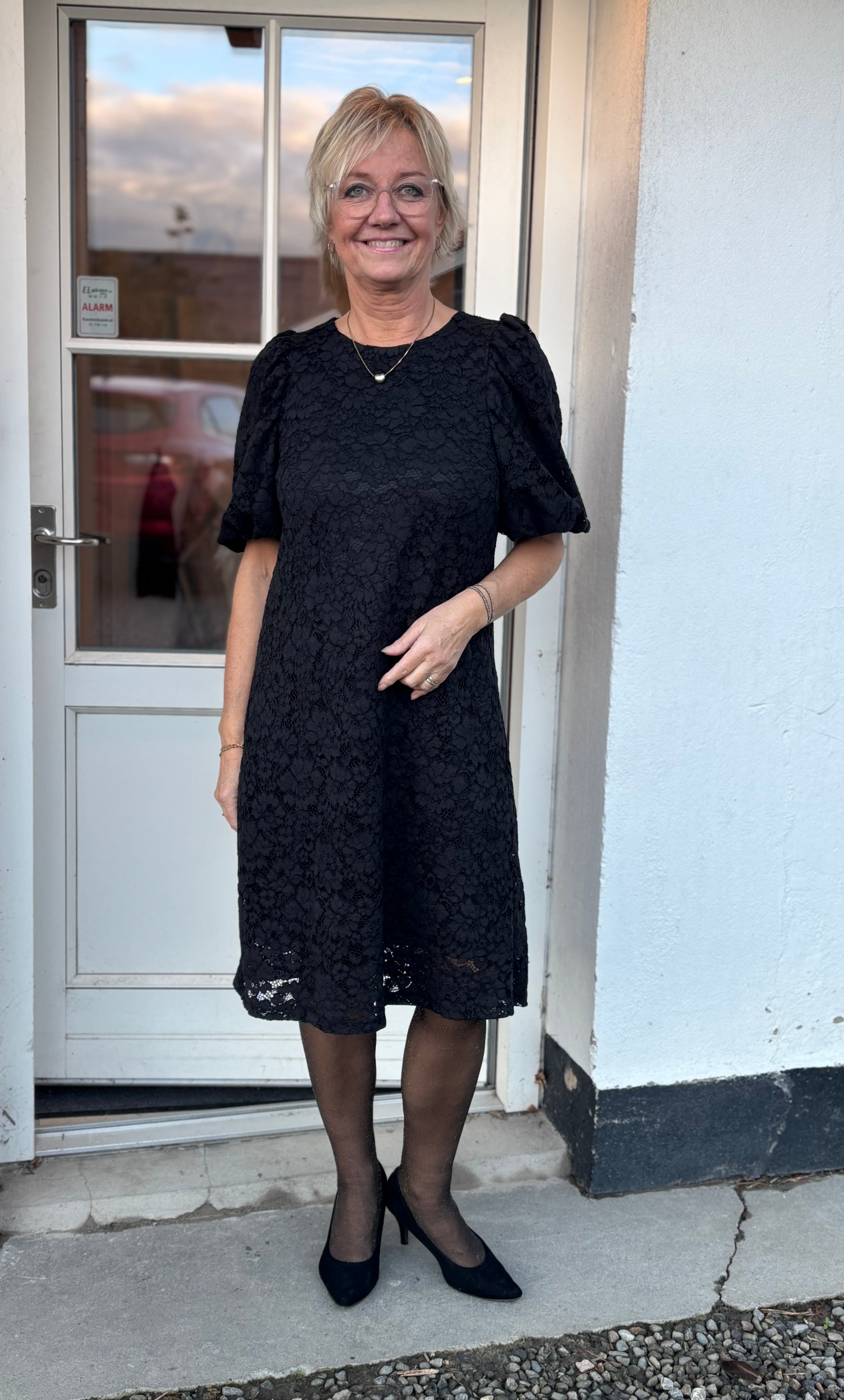 Let taljeret blondekjole med rund hals og pufærme. Kjolen er gennem foret.