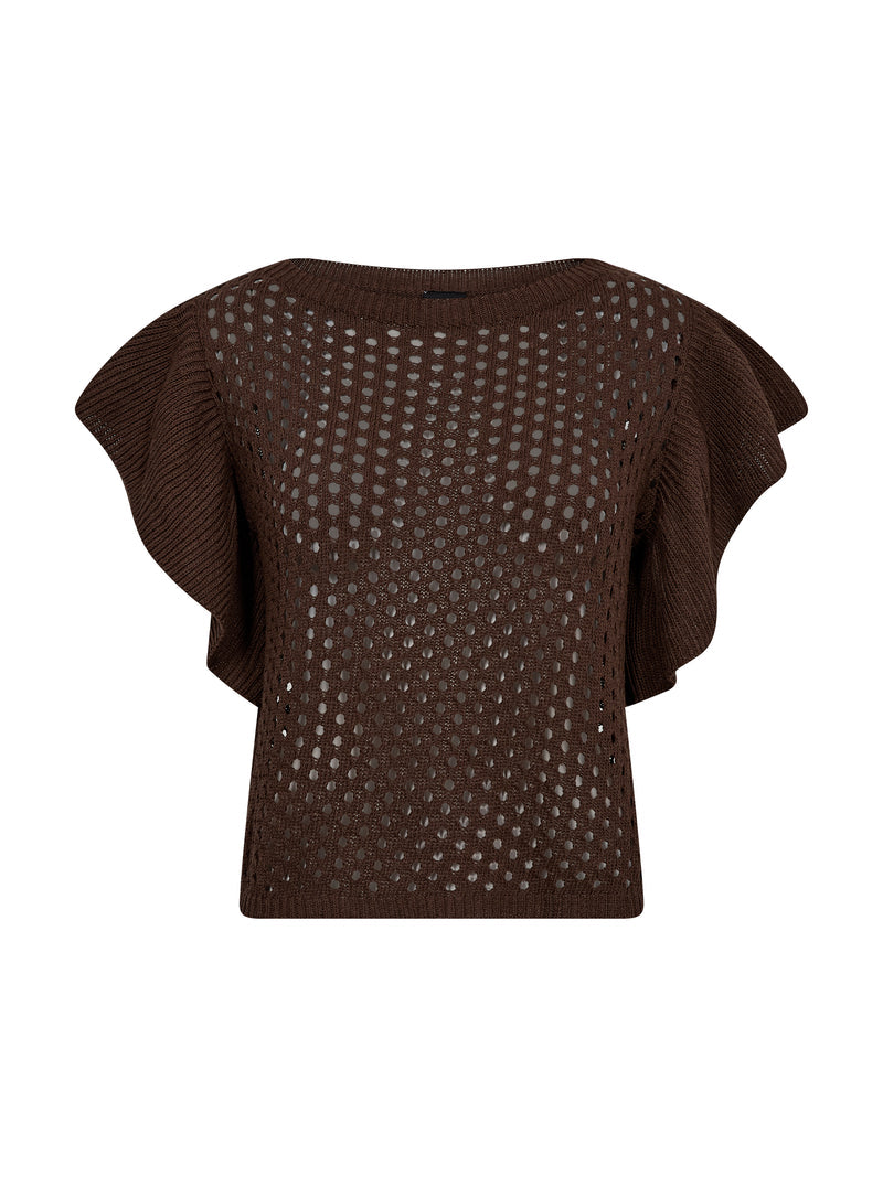 Løft dit hverdagslook med denne lette og luftige strikbluse fra NÜ, der kombinerer et feminint udtryk med moderne detaljer. Den har et åbent hulmønster over hele fladen og brede, bølgende ærmer, som skaber en smuk silhuet. Pasformen er let boxy, og blusen har rund halsudskæring.