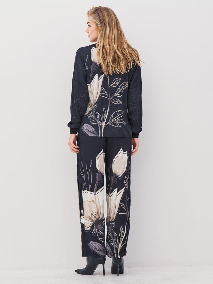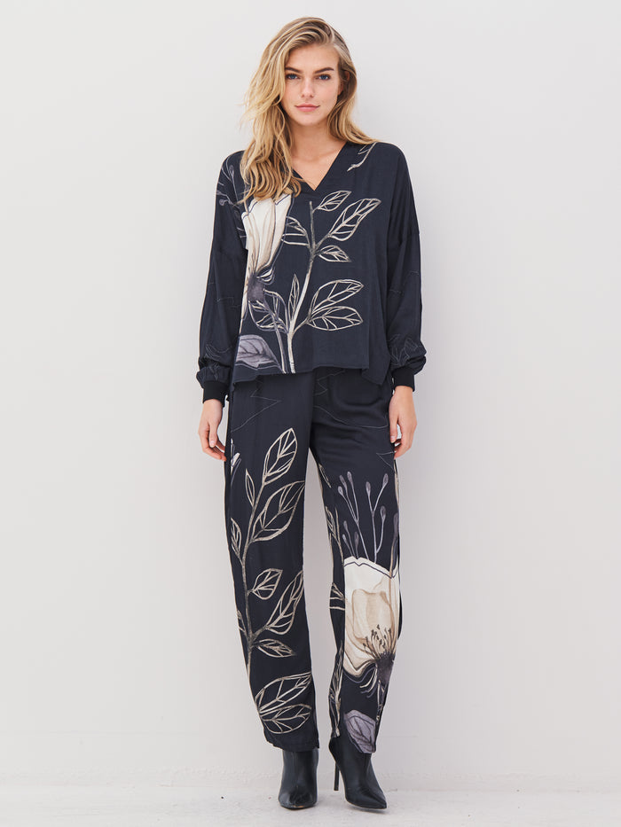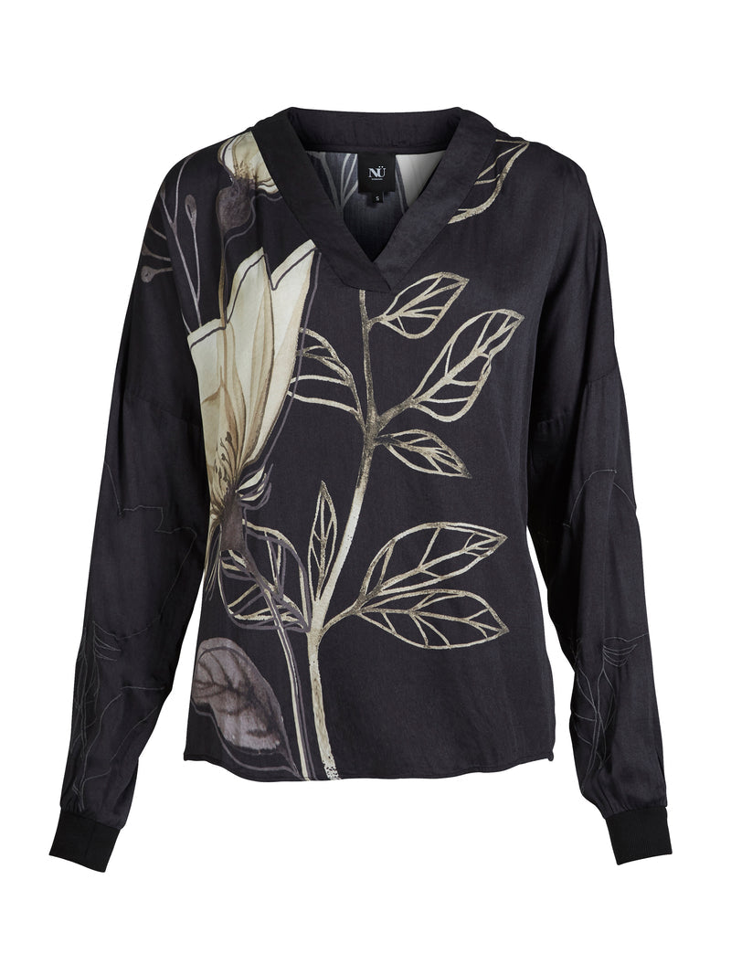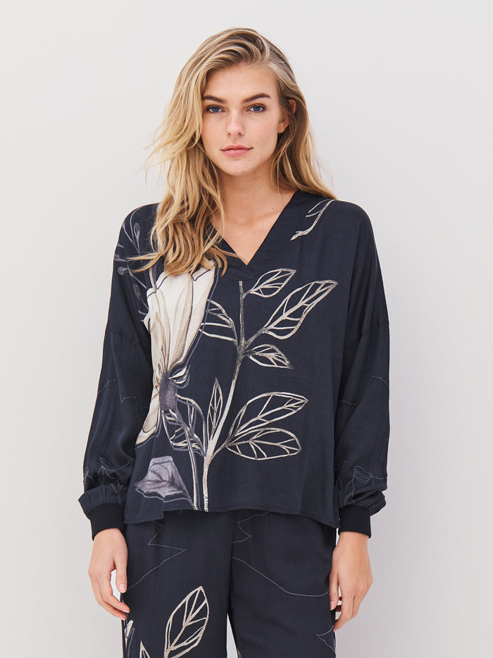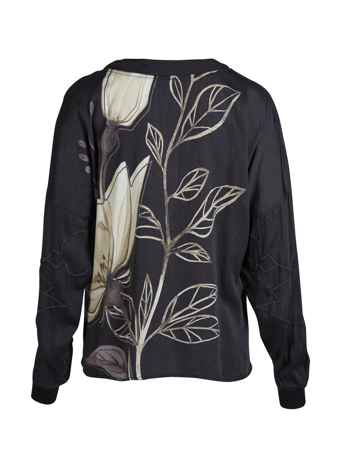 Denne bluse kombinerer en afslappet pasform med et smukt, håndtegnet blomsterprint, der strækker sig elegant over både for- og bagside. Blusen har en V-udskæring med bred kant og lange ærmer med ribafslutning, som giver et sporty twist til det feminine design.