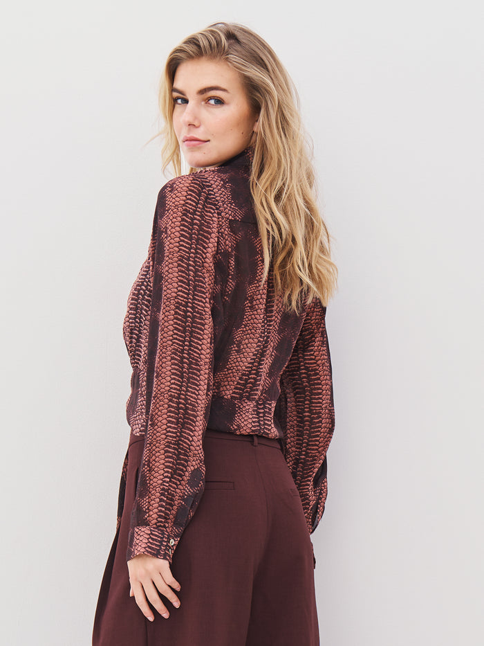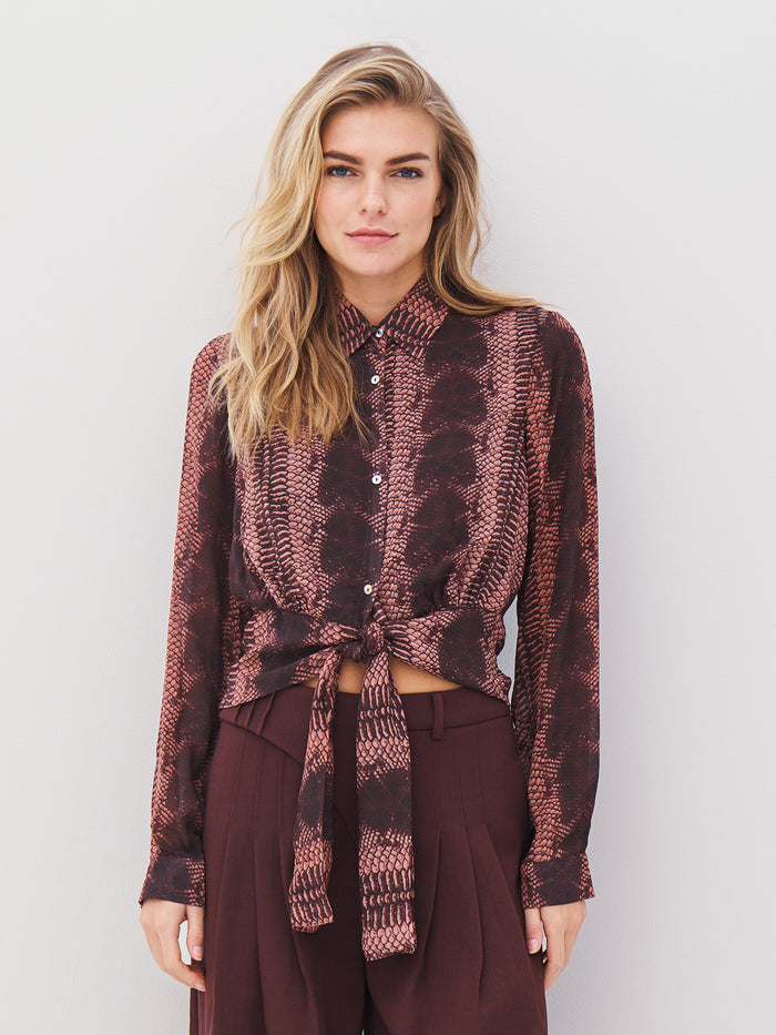 Skil dig ud med denne skjorte, der kombinerer et iøjnefaldende slangeprint med en feminin silhuet. Skjorten har lange ærmer med manchet og klassisk krave, mens fronten bindes med et bredt knytbånd, som skaber en markeret talje og et moderne twist. Den lette kvalitet og cropped længde gør den perfekt til både hverdag og aften.