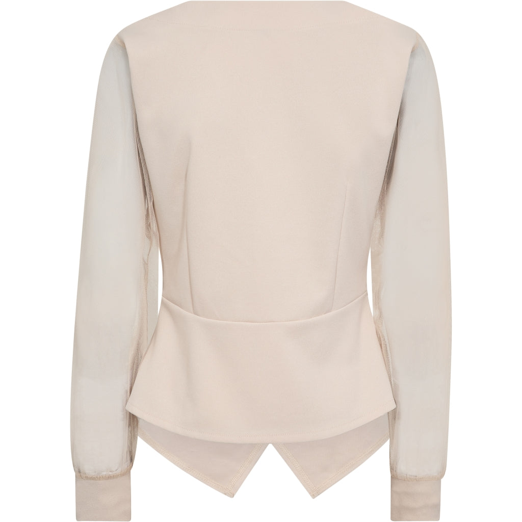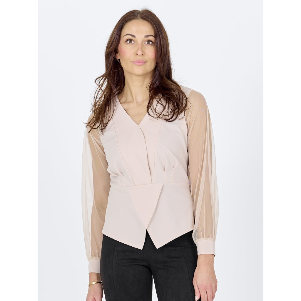 Blusen har et tætsiddende snit med smukke læg foran og en defineret talje, der giver en elegant silhuet. Den dybe V-udskæring og asymmetriske frontfinish tilføjer et moderne touch, mens de lange mesh-ærmer med manchetter skaber en let og dejlig kontrast. Ryggen er enkel og følger kroppens form.