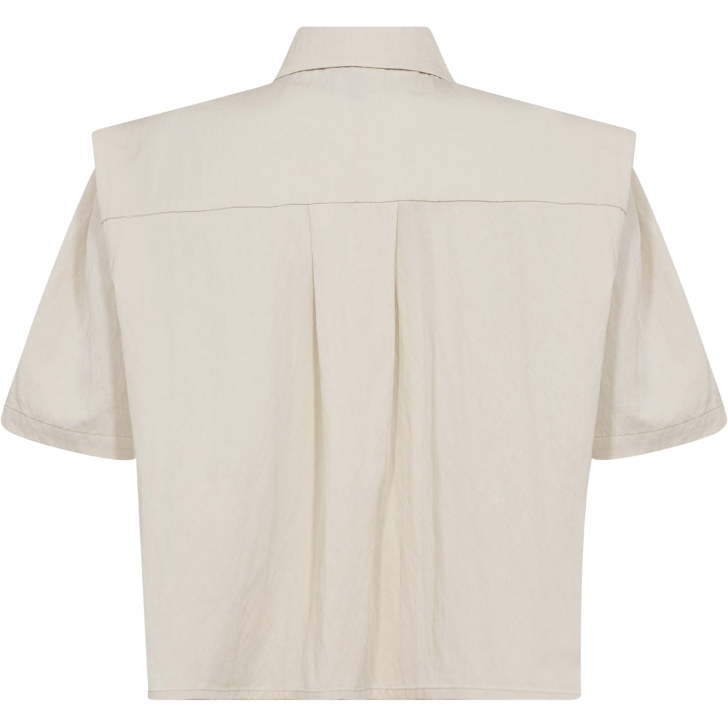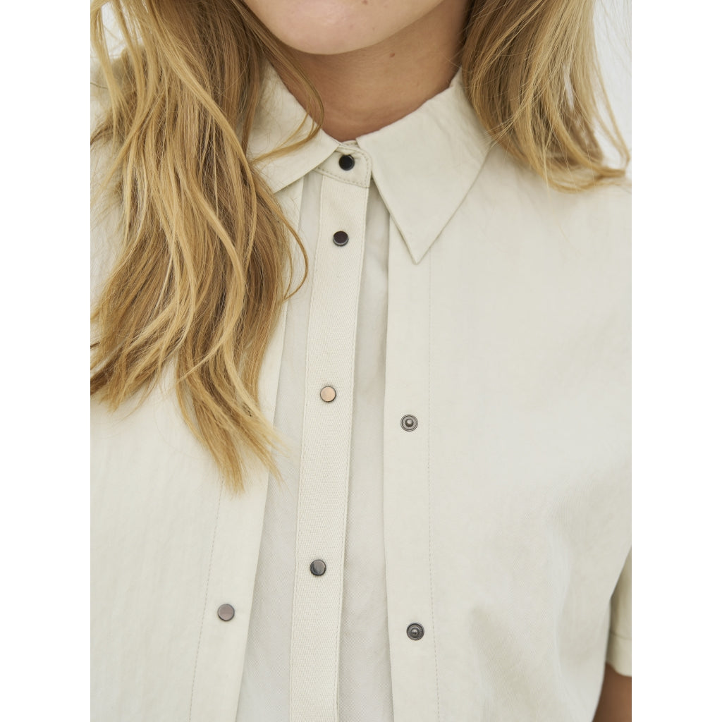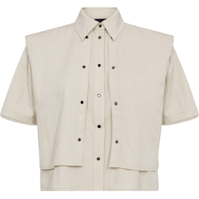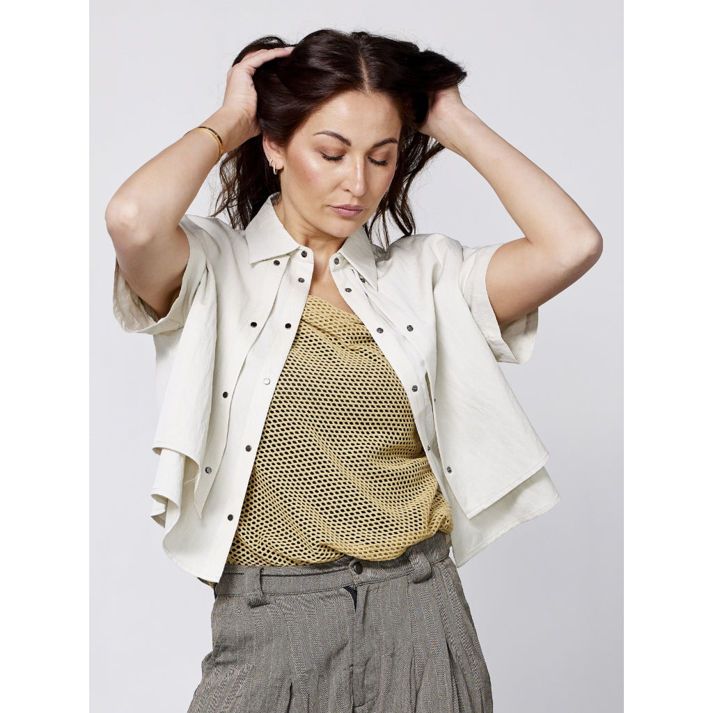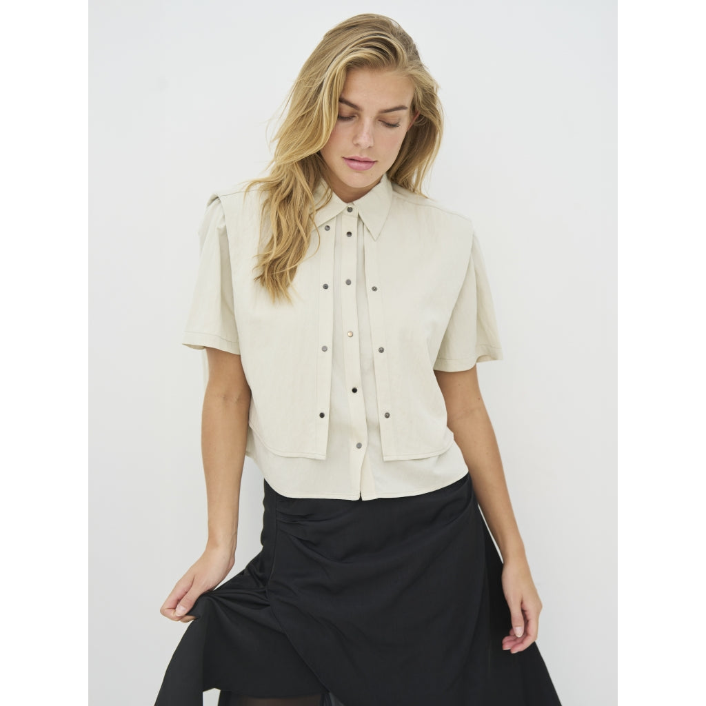 Denne skjorte/Bolero har et kort og moderne snit med korte ærmer og en klassisk krave. De dekorative trykknapper foran giver den et råt og poleret look, mens den lagdelte front tilføjer lidt ekstra kant til skjorten. Pasformen er lige og let firkantet, hvilket gør den nem at style både lukket og åben. Skjortens ryg er enkel og falder pænt ned langs ryggen. Brug den over en top eller kjole, eller style den med højtaljede bukser for et afslappet, men stilfuldt look.