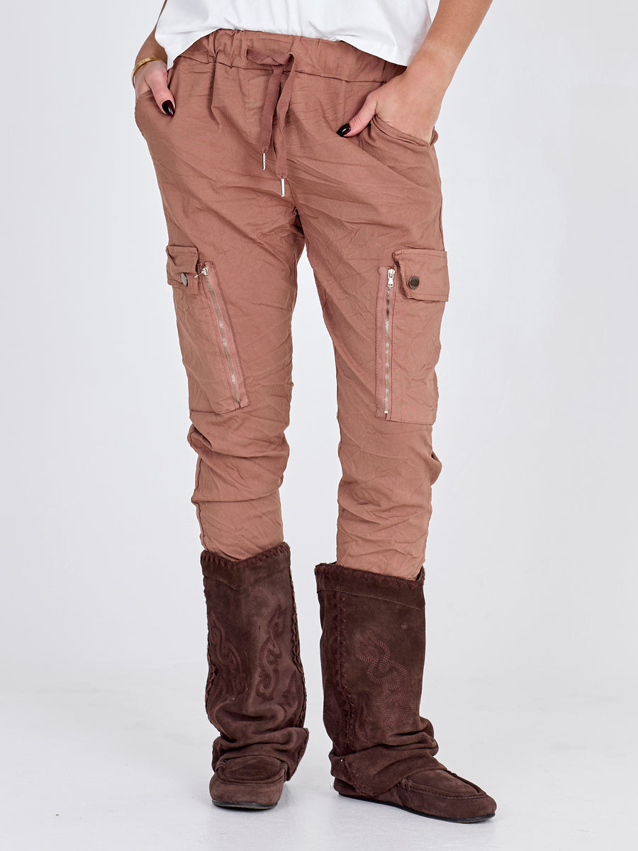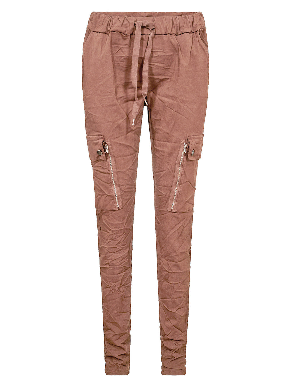 Disse cool bukser fra NÜ er i en lækker bomuldskvalitet med masser af stretch. Bukserne har en let baggy pasform og en elastisk talje med bindebånd, der sørger for en fantastisk komfort. Midt på bukserne er der to store lommer med knapper samt en lang pyntelynlås, som giver en rå detalje.