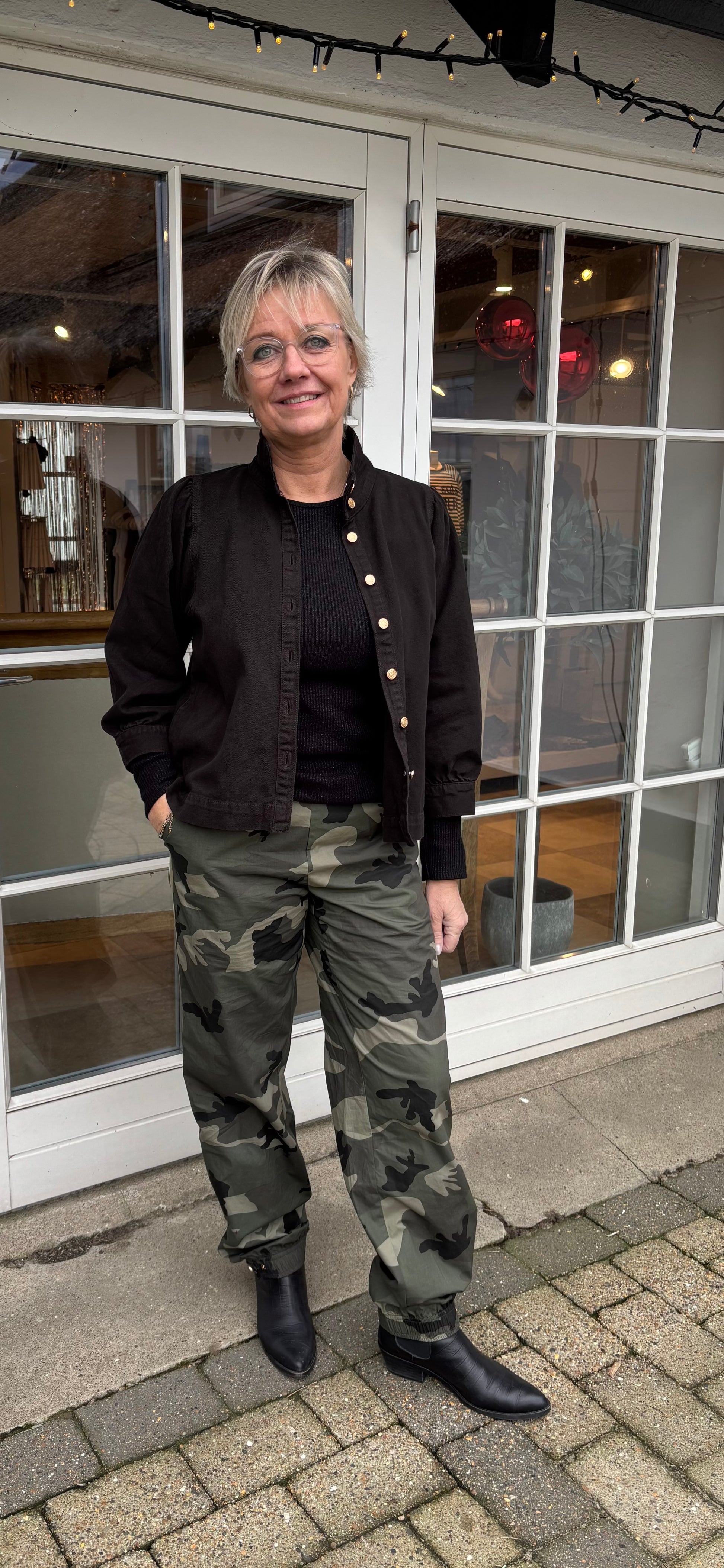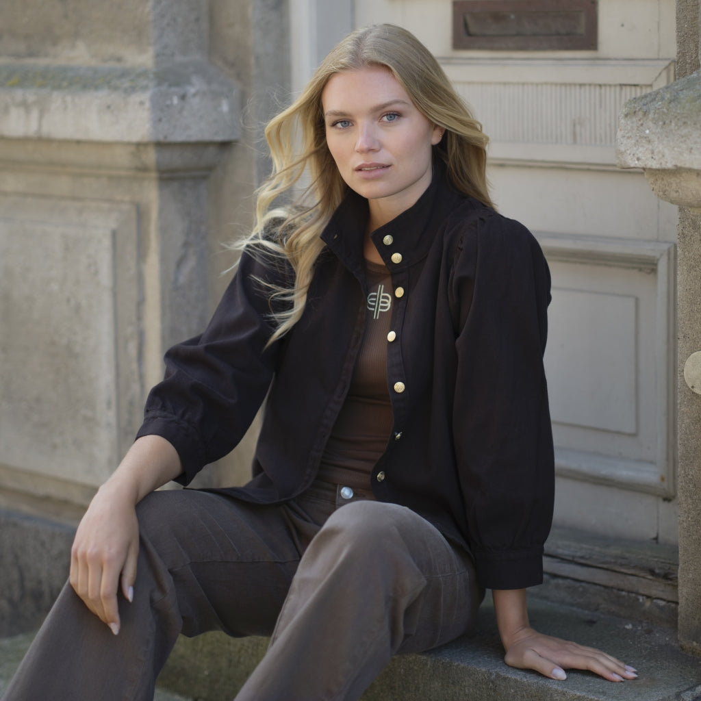 Figga Blouse er en skøn denim skjorten, som også kan bruges som en let jakke. Skjorten er enkel i snittet med en fin detalje i form at det påsyet ærme med et lille puf ved skulderen. Skjorten har en høj hals, 3/4 lange ærmer og er gennemknappet med otte knapper.