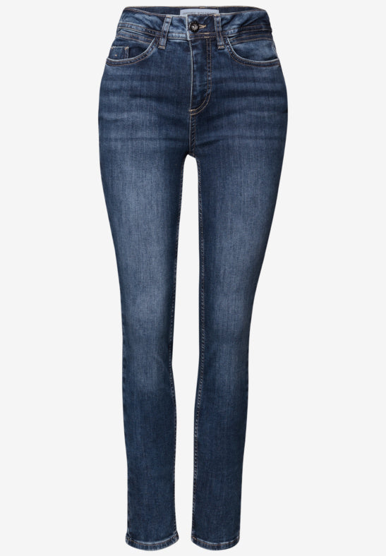 York-jeansene fra Street One til kvinder har en moderne høj talje og smalle ben. Den mørkeblå vask har et klassisk og elegant look, mens den strækbare bomuldsblanding sikrer en perfekt pasform. Brug disse slim fit jeans for at fremhæve din figur, eller vælg en størrelse større for en mere afslappet pasform.